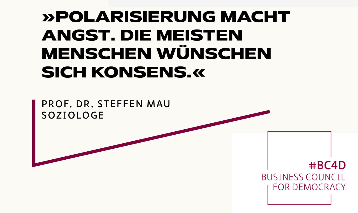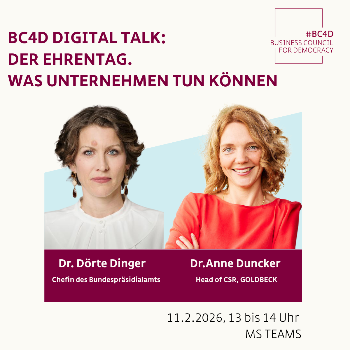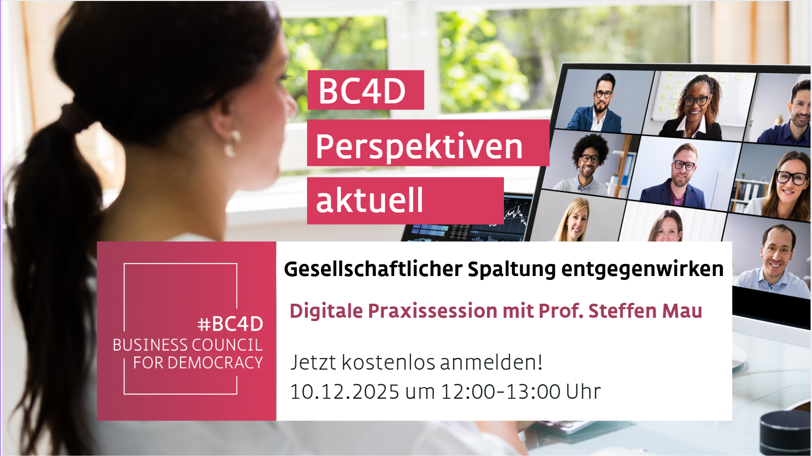 Die liberale Demokratie ist unter Druck. Sie zu stärken und widerstandsfähig zu machen, ist eine Aufgabe für alle Teile der Gesellschaft, auch für die Wirtschaft. Vielen Unternehmern und Managern ist das ein Anliegen. Sie nehmen als Bürger Anteil an der politischen Kultur und haben als Arbeitgeber, Exporteure oder Investoren ein natürliches Interesse am sozialen Frieden und am gesellschaftlichen Zusammenhalt. Der Business Council for Democracy (BC4D) ist ein Angebot an sie, sich mit Gleichgesinnten zu vernetzen und zudem durch Schulungen der Mitarbeitenden aktiv gegen die Ausbreitung von Hassrede, gezielter Desinformation und Verschwörungsmythen zu wirken.
