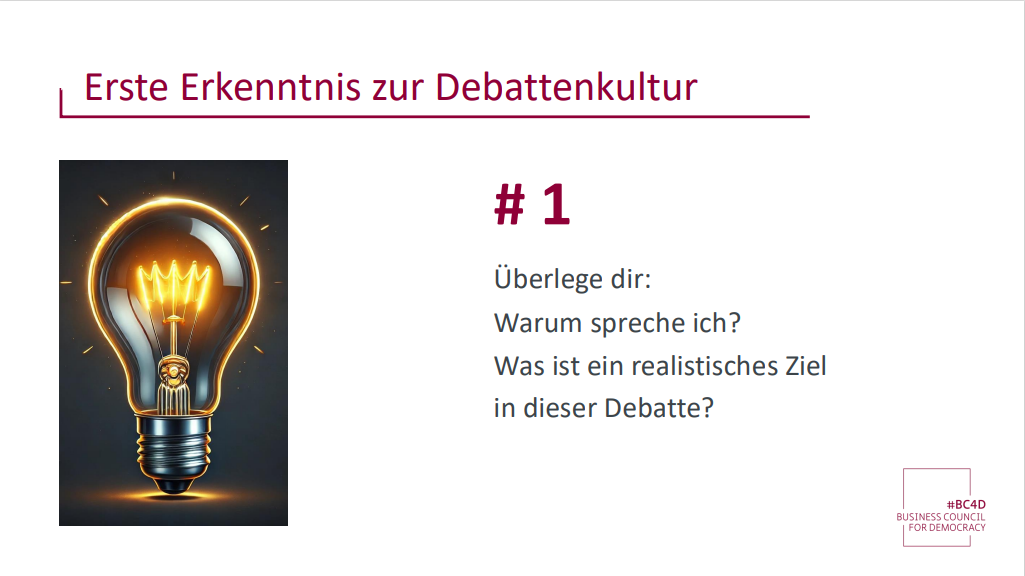 Die liberale Demokratie ist unter Druck. Sie zu stärken und widerstandsfähig zu machen, ist eine Aufgabe für alle Teile der Gesellschaft, auch für die Wirtschaft. Vielen Unternehmern und Managern ist das ein Anliegen. Sie nehmen als Bürger Anteil an der politischen Kultur und haben als Arbeitgeber, Exporteure oder Investoren ein natürliches Interesse am sozialen Frieden und am gesellschaftlichen Zusammenhalt. Der Business Council for Democracy ist ein Angebot an sie, sich mit Gleichgesinnten zu vernetzen und zudem durch Schulungen der Mitarbeitenden aktiv gegen die Ausbreitung von Hassrede, gezielter Desinformation und Verschwörungsmythen zu wirken.