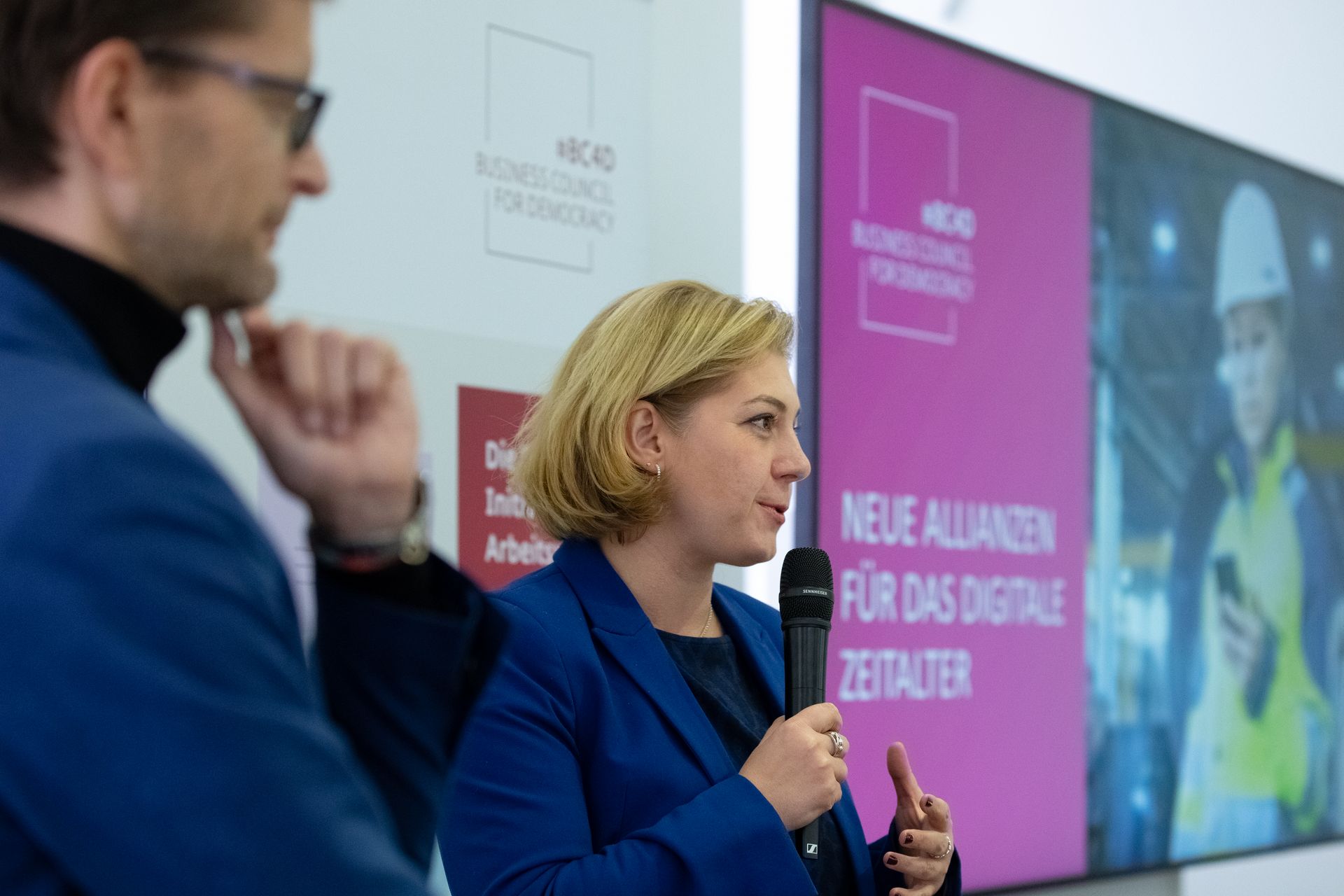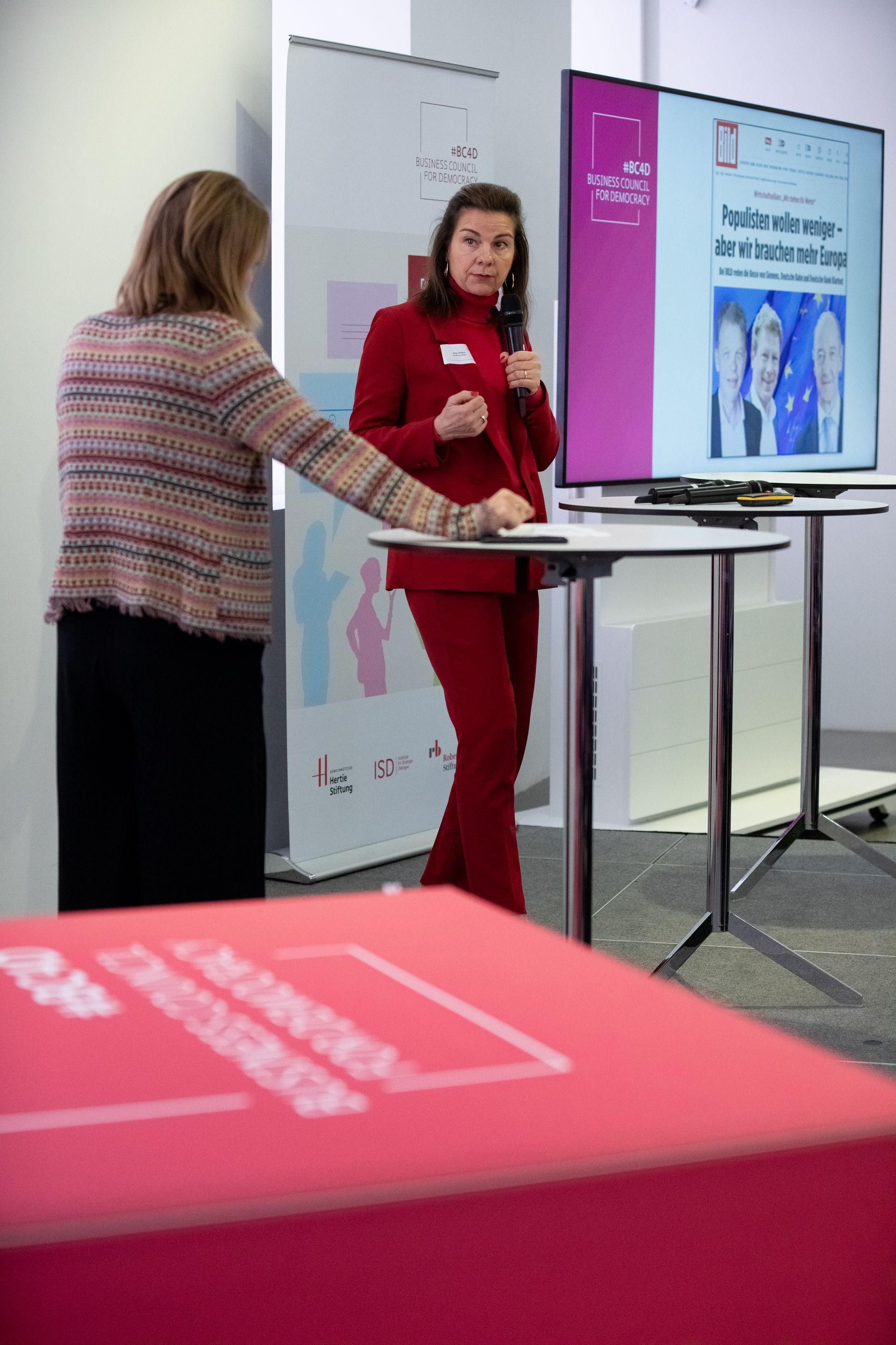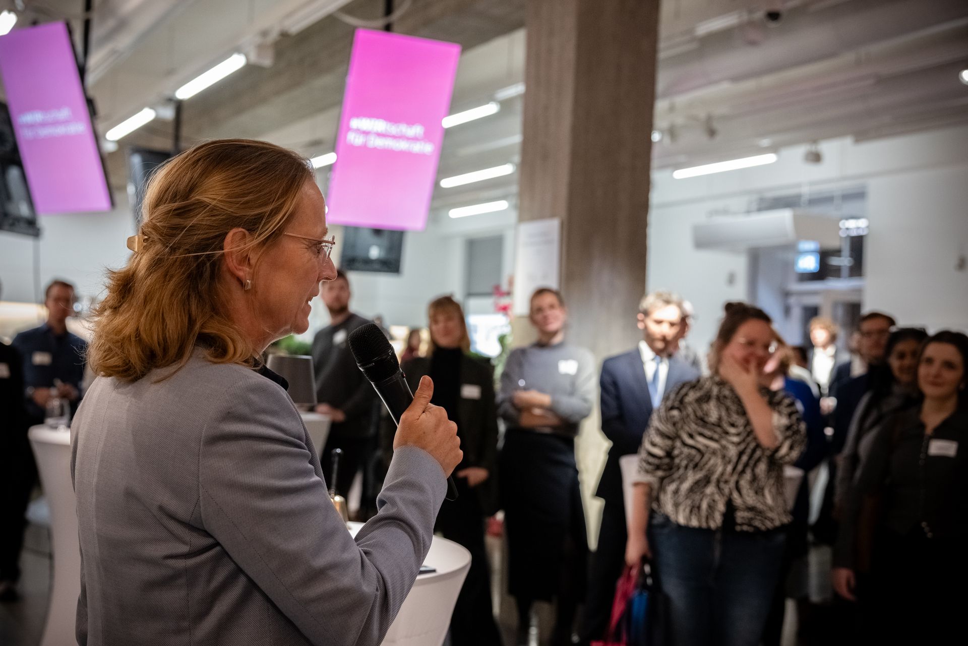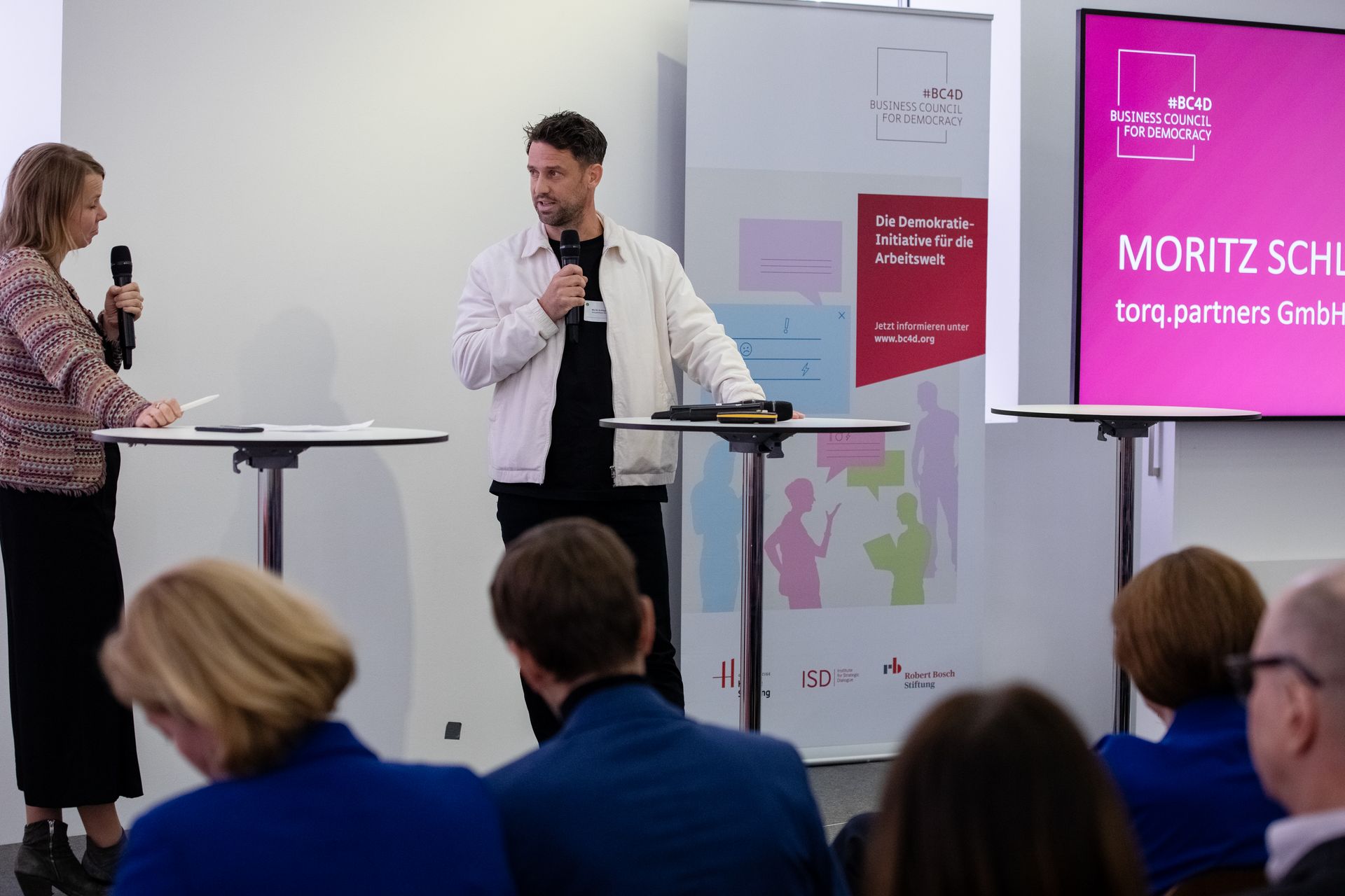 „Haltung kann man trainieren, aber man muss sie erstmal haben“, so Sven Scharnhorst (Evonik) bei unserem Netzwerktreffen. Die Veranstaltung zeigte erneut: Die BC4D-Mitglieder gehen mit Haltung voran und bewegen damit Gutes – für ihre Unternehmen, wie auch für die Gesellschaft. Moderiert von Helene Bubrowski (table.media) teilten Moritz Schlageter (torq.partners), Daniel Montua (DHL Group), Anja Bröker (DB), Sven Scharnhorst (Evonik) und Annemarie Hühne-Ramm (Bayer/Hans und Berthold Finkelstein Stiftung) unternehmensinterne Best Practices. Hier und beim Impuls von Bestsellerautorin und Wirtschaftsjournalistin Ursula Weidenfeld, wurde klar: Demokratie braucht den direkten Austausch und eine respektvolle Debattenkultur.