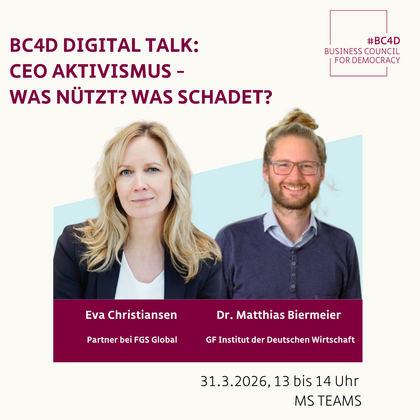 Eine neue Studie des Instituts der deutschen Wirtschaft in Kooperation mit dem Internationalen Hochschulinstitut Zittau der TU Dresden zeigt, wie unterschiedlich politische Botschaften aus der Unternehmensführung bei Menschen je nach parteipolitischer Verortung wahrgenommen werden. Was bedeutet das für Unternehmen, die sich für die Stärkung der Demokratie engagieren? Über Chancen, Risiken und Nebenwirkungen von CEO-Aktivismus und alternative Formen des Engagements sprechen wir im BC4D Digital Talk mit Eva Christiansen, Partner bei FGS Global (Kampagne “Wir stehen für Werte”) und Dr. Matthias Diermeier, dem Geschäftsführer des Instituts der deutschen Wirtschaft.
